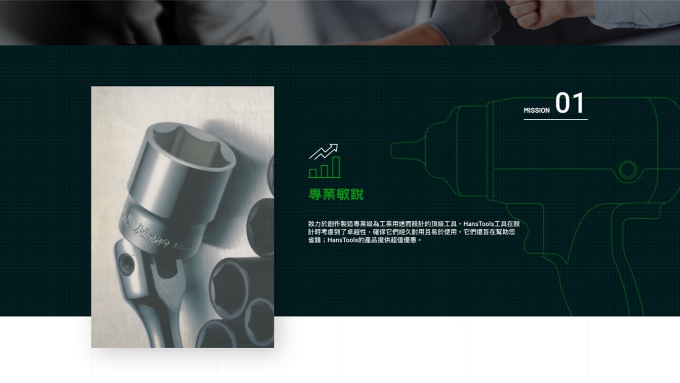 以手繪工具及大量照片作為設計元素,使用大量圖片去凸顯 HANS TOOLS 向得行興業 專業的工業形象,在局部畫面中點綴手繪插圖,讓整體風格呈現乾淨專業卻不沈重的氛圍