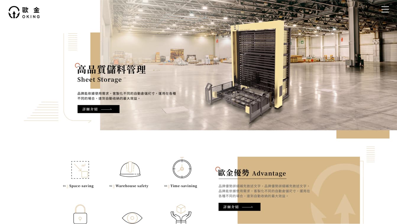 進入頁面時的進場動態特效延伸自《 歐金 OKING 》的收納倉儲機臺的獨特外觀,透過先後有序的橫向進場動畫讓使用者閱讀更加清晰舒適。