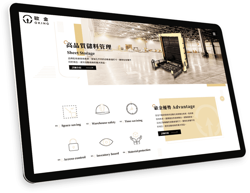 進入頁面時的進場動態特效延伸自《 歐金 OKING 》的收納倉儲機臺的獨特外觀,透過先後有序的橫向進場動畫讓使用者閱讀更加清晰舒適。