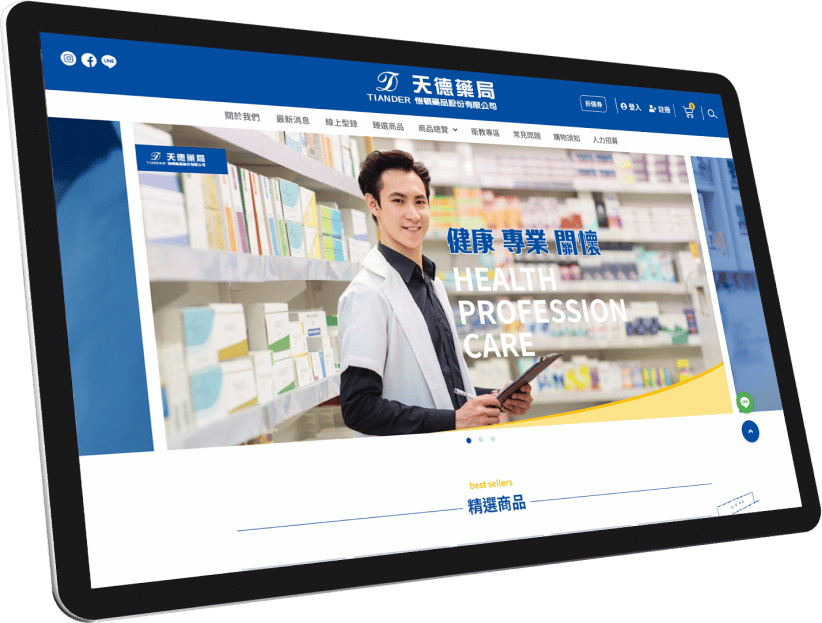 透過企業主要藍色為主要構成,以整齊乾淨的版面設計,帶出天德藥局專業、值得信賴的氛圍,再透過圓弧的設計&插畫角色的穿插運用,增添藥局品牌的親和感。