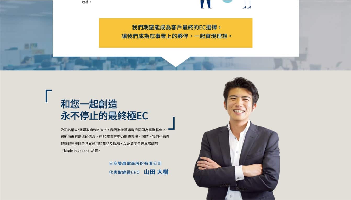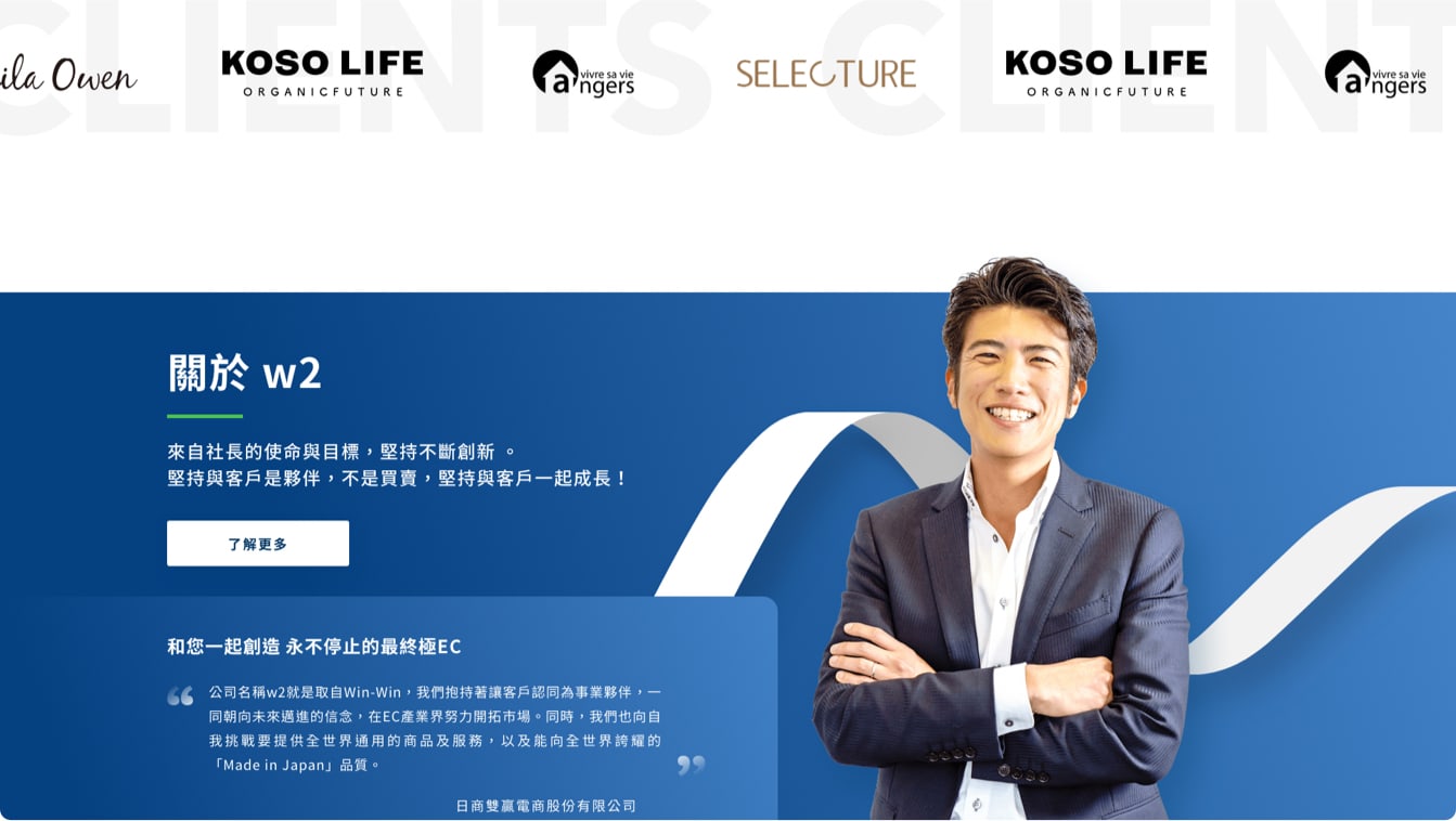 來自日本的日商雙贏W2 SOLUTION擁有最完整的電商平台功能,提供自有開發系統及諮詢顧問,透過持續畫的技術以及長期累積豐富的knowhow,幫助各業界剛起步的店家及大型企業解決問題,提升業績。